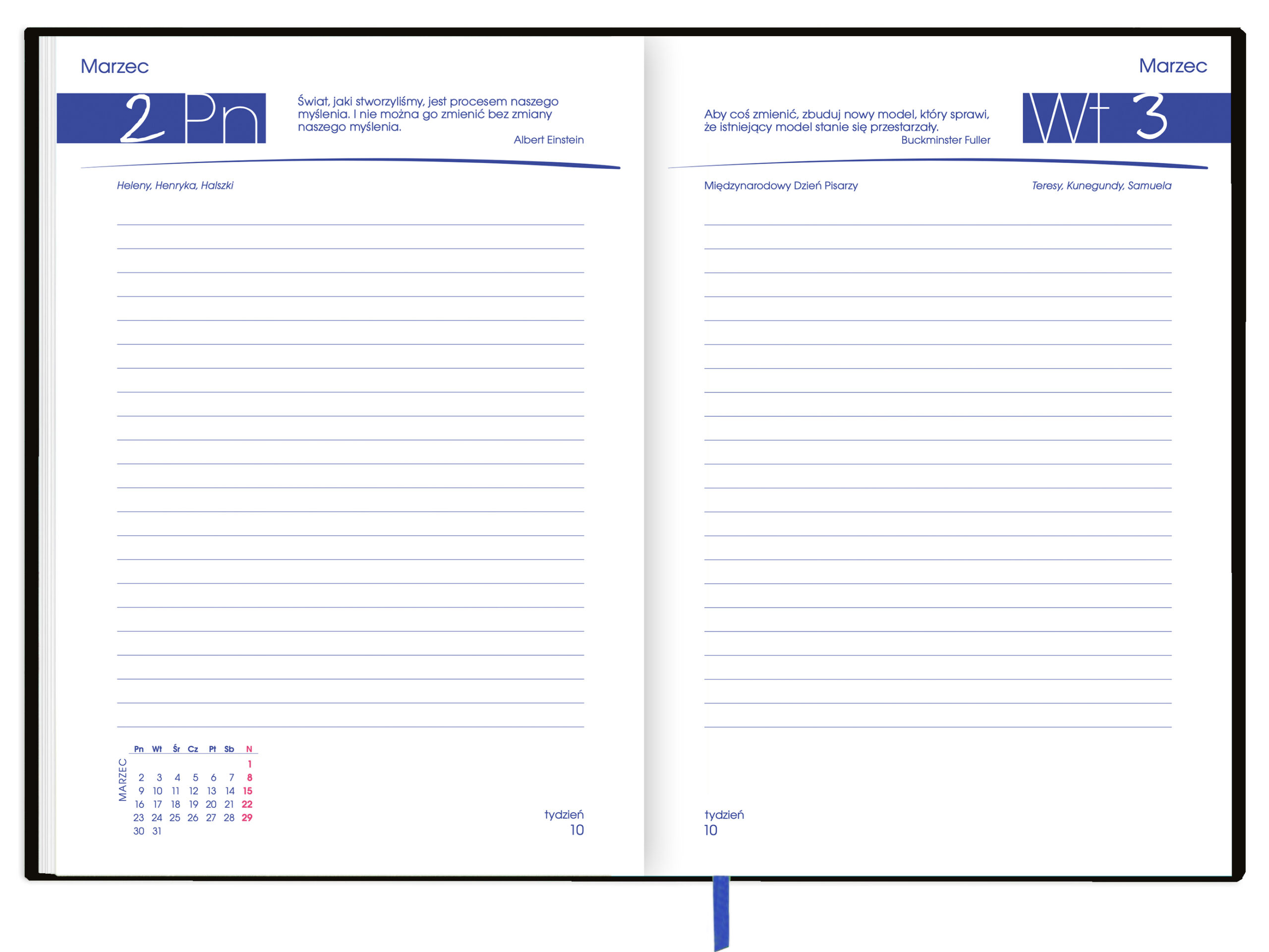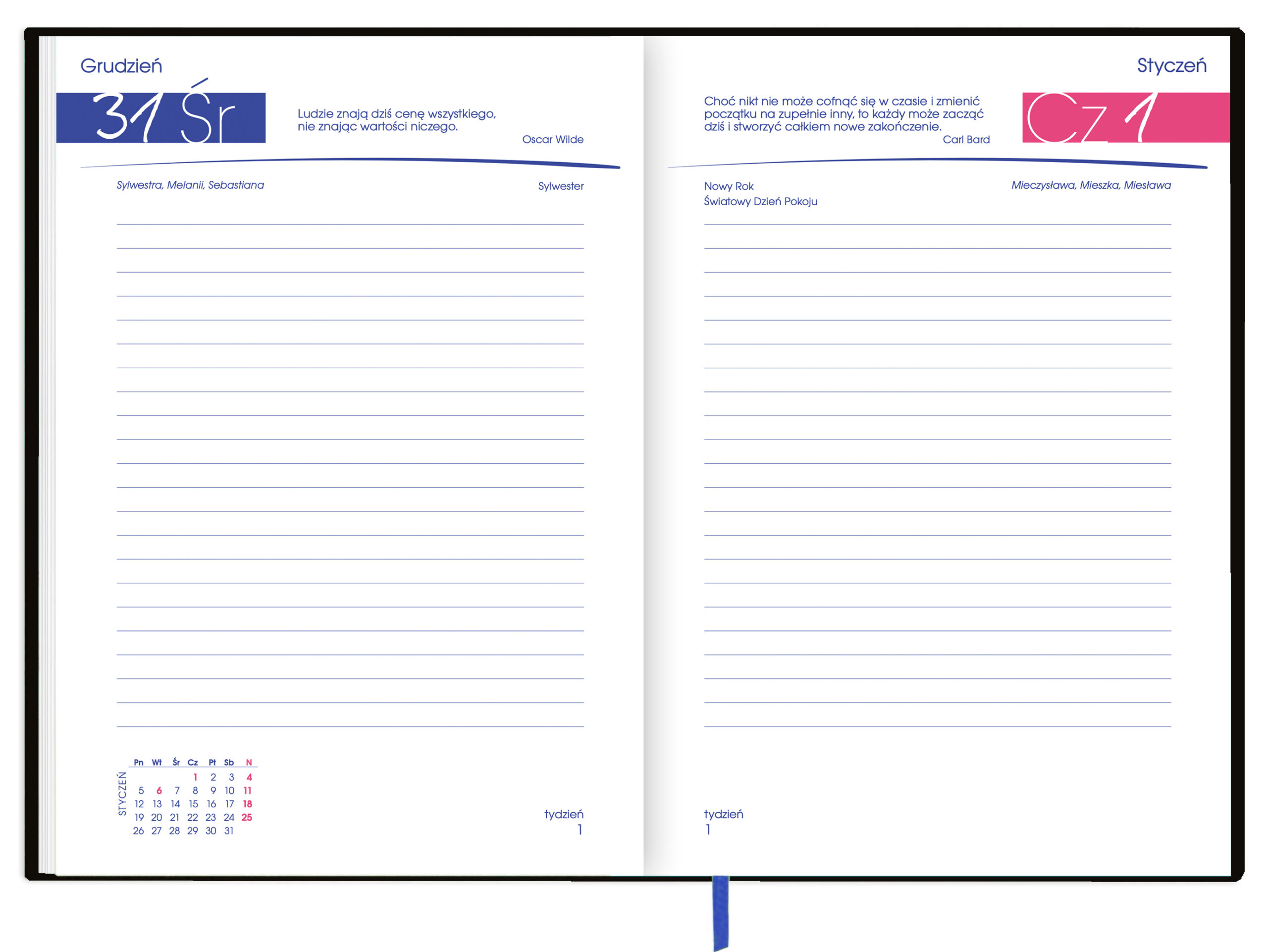 - Układ: rozkładówki z dużą przestrzenią na zapiski i swobodne planowanie dnia