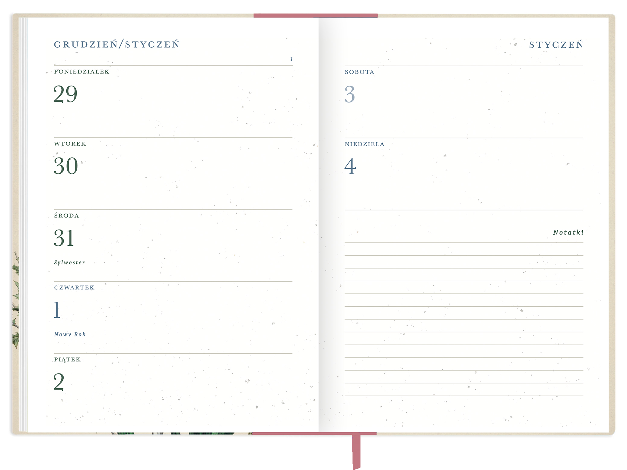Kalendarz wyróżnia się eleganckim płóciennym grzbietem oraz starannie dobranymi botanicznymi ilustracjami. Każdy miesiąc rozpoczyna się pięknym cytatem, wprowadzając w wyjątkowy nastrój i nadając planowaniu nutę refleksji.