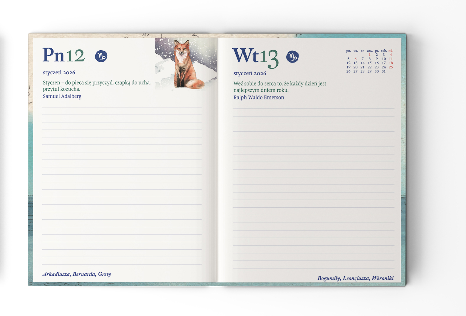 Produkt idealny dla osób szukających funkcjonalnego i estetycznego kalendarza na rok 2026 z motywami przyrodniczymi i inspirującymi cytatami.