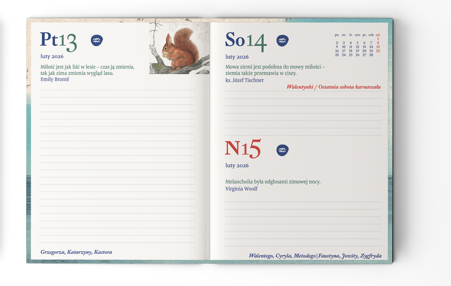 - na każdej rozkładówce małe kalendarium z bieżącym miesiącem