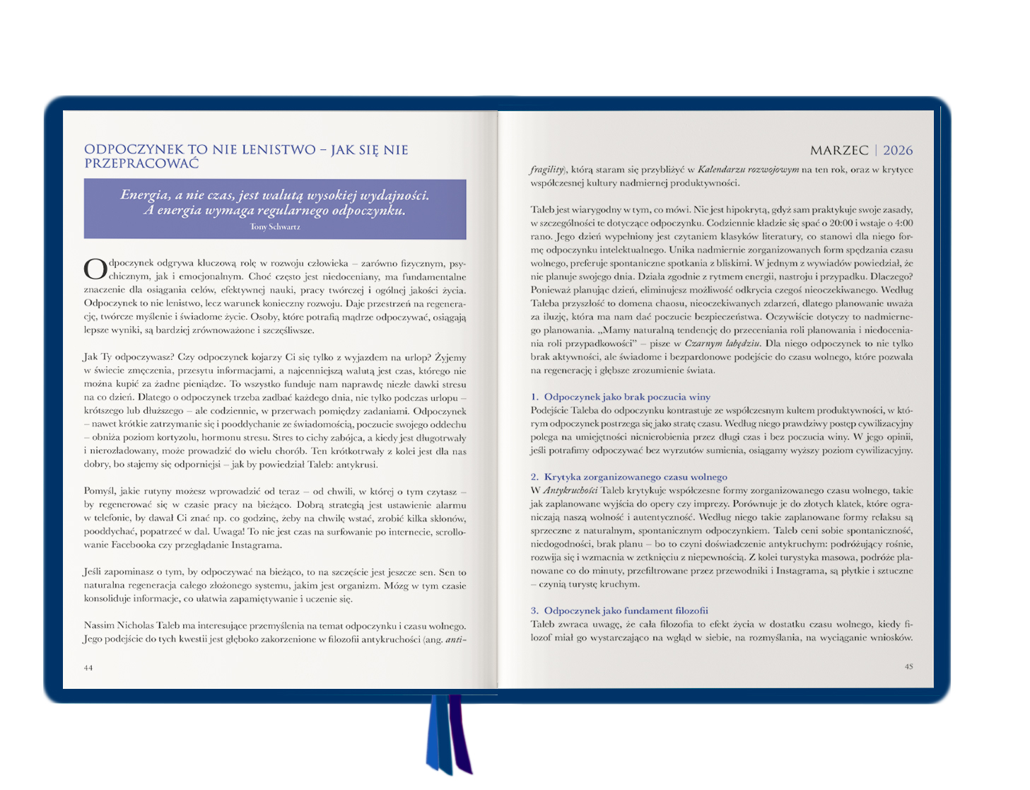 Kalendarz przybliża również poglądy i filozofię życiową Nassima Nicholasa Taleba – słynnego myśliciela, autora bestsellerów Czarny łabędź i Antykruchość. który wskazuje jak radzić sobie z niepewnością i wykorzystywać chaos jako siłę napędową rozwoju. W świecie zmieniającym się w niespotykanym dotąd tempie, oswaja ze zmianą i pozwala zniwelować strach przed tym, co nieznane. Znajomość tego podejścia daje konkretną przewagę i buduje odporność psychiczną.