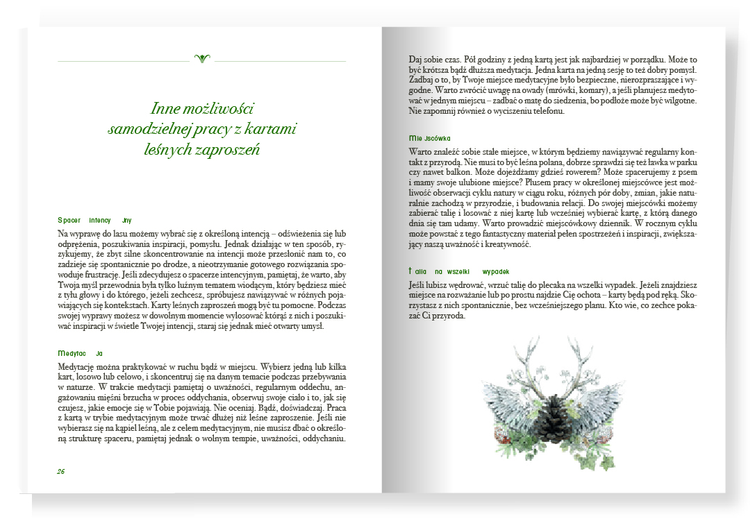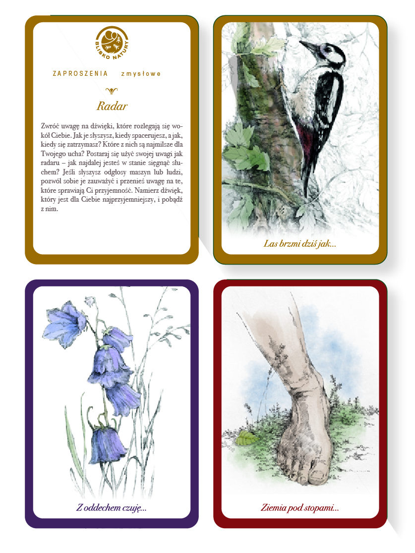 W zestawie znajduję się 50 kart leśnych z ćwiczeniami, zwanymi zaproszeniami, które ułatwią podłączenie się pod rytm natury.